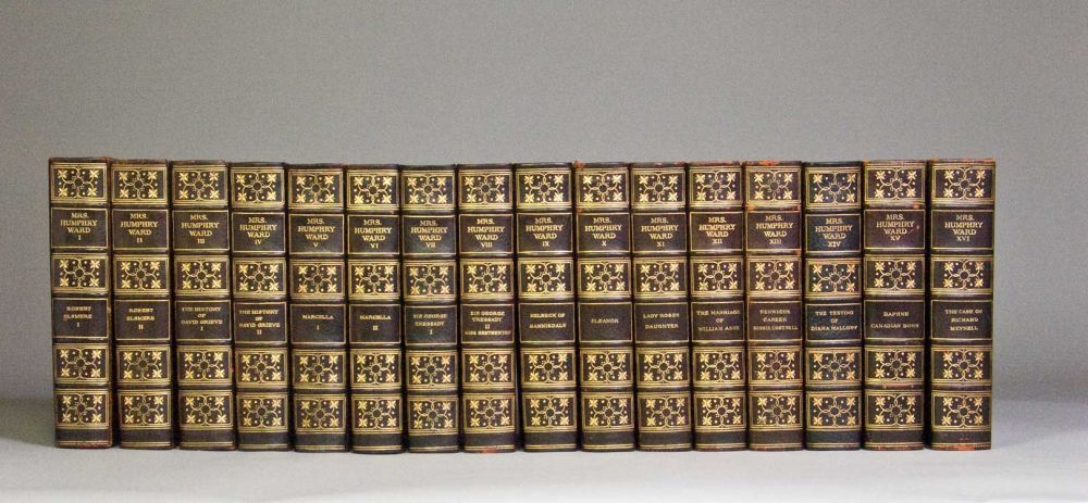 Boston and New York: Houghton Mifflin Co, 1912. Autograph Edition, No. 20 of 750 copies signed by the author on the half title of Volume One, "Mary A. Ward. Illustrated throughout with hand-colored frontispiece in each volume by Archibald Standish, Hartrick, Charles E. Brock, etc. With two states of the plates. 16 vols. Thick 8vo. Bound in three-quarters blue morocco gilt, marbled boards and endpapers by the Riverside Press Bindery. Some minor wear to some heads else almost fine. Autograph Edition, No. 20 of 750 copies signed by the author on the half title of Volume One, "Mary A. Ward" Illustrated throughout with hand-colored frontispiece in each volume by Archibald Standish, Hartrick, Charles E. Brock, etc. With two states of the plates. 16 vols. Thick 8vo. This is an extraordinary set with each volume having a page of manuscript (some heavily corrected) in the hand of the author. Volumes 7, 10, 11 and 12 each have two pages of manuscript; a total of twenty full pages of corrected manuscript.