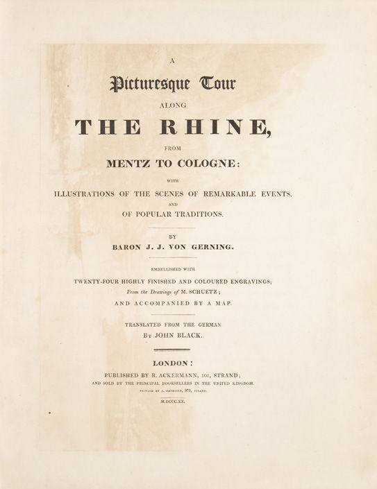 London: R. Ackermann, 101, Strand, 1820. First edition, early issue, with the plates unnumbered. 24 hand-colored aquatint plates after M. Schuetz, 1 map. xiv, [2], [1]-178 pp. 1 vols. Folio (13 1/4 x 11 in.). Contemporary polished calf, spine gilt, all edges gilt, rebacked, corners somewhat rubbed, offsetting from plates and text, very good, attractive copy. First edition, early issue, with the plates unnumbered. 24 hand-colored aquatint plates after M. Schuetz, 1 map. xiv, [2], [1]-178 pp. 1 vols. Folio (13 1/4 x 11 in.). One of Ackermann’s most breathtaking color plate books — these exquisite views of the Rhine are justly prized for their matchless beauty. Abbey Travel 217; Martin Hardie, pp. 107-8, 312; Prideaux, p. 337; Tooley (1954), # 234