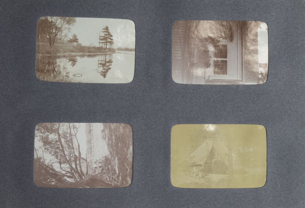 [N.p., American Northeast, 1900. 96 3 x 2 inch Kodak Brownie photographs, mounted 4 to a page. Oblong 8vo. Brown cloth album. Photographs generally fine. 96 3 x 2 inch Kodak Brownie photographs, mounted 4 to a page. Oblong 8vo. Includes deerhunting scenes, camping, fishing from a boat and netting fish near a dam, boating, canoeing; views of farm, field and woods; draught horses; and winter camping.