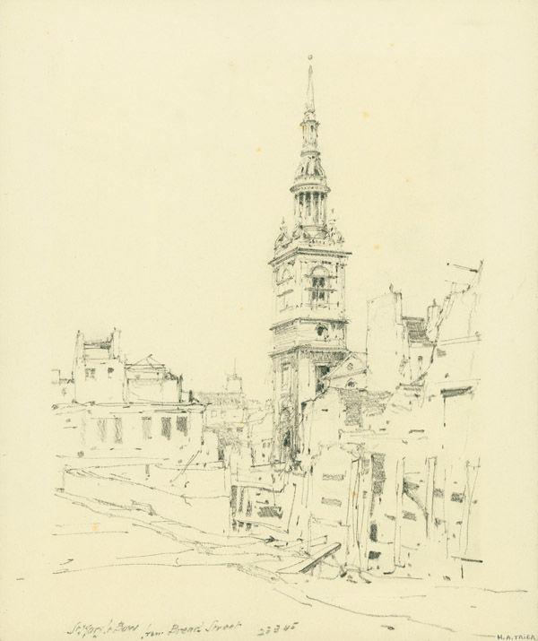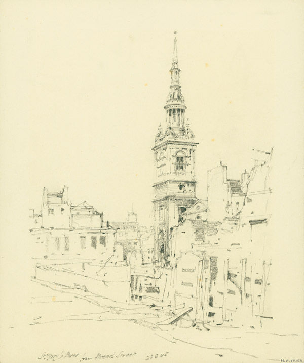 “St. Mary Le Bow / from Bread Street / 23-3-45”: Original pencil rendering of the blitzed London church and surrounding buildings, captioned and dated