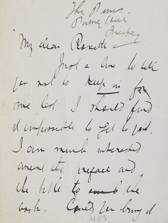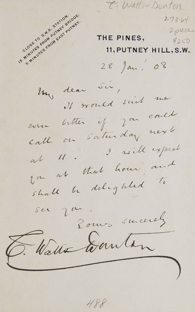 The Pines, Putney Hill, 1908. Two pages and one page respectively. 1 vols. Sm. 8vo. To “My dear Rossetti” and “My dear Sir.” Some light discoloration, the first folded, lower edge rough else very good (2 pieces). Two pages and one page respectively. 1 vols. Sm. 8vo. Watts-Dunton was a friend of both Michael and Dante Gabriel Rossetti and acted as Gabriel Rossetti's solicitor. Watts Dunton writes to William Michael Rossetti to say not to wait at home for him in case he's delayed and continues “I am much interested [ ] the preface and the title to the book. Could you bring it to Somerset House and let me have a peep at it.” and comments that he hopes “that Mrs. Rossetti is feeling all right.” Watts-Dunton was involved in encouraging Gabriel Rossetti in the publication of the works that became “Ballads and Sonnets” in 1881 but would also have been interested in any of the collections and editions of Gabriel's works that Michael produced.¶ The second letter, recipient unidentified, states that he would prefer for him to call on Saturday and looks forward to seeing him.