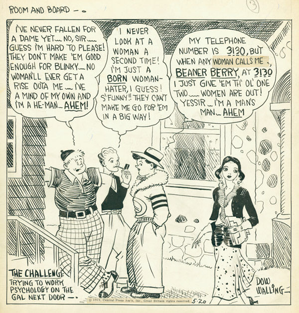 n.p.: The Central Press Association, 1931. The cartoon shows three young men trying “psychology” on the pretty girl next door. 1 vols. 10-1/2 x 10-1/2 inches. The cartoon shows three young men trying “psychology” on the pretty girl next door. 1 vols. 10-1/2 x 10-1/2 inches. A vintage cartoon by the artist who later created the popular comic strip “Skeets”.