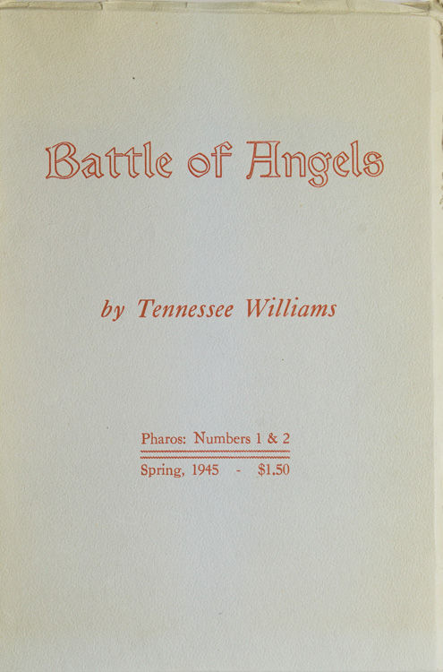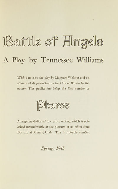 Battle of Angels. A Play by Tennessee Williams. With a note on the play by Margaret Webster and an account of its production in the City of Boston by the author, This publication being the first number of Pharos. Pharos Number 1 & 2