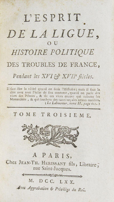 The notice Barbier refers to is a fascinating bibliography of 87 books dealing with the subject of the Holy League, with useful comments and observations by Saint-Léger. Barbier II 189 (editions of 1767 & 1777 only)