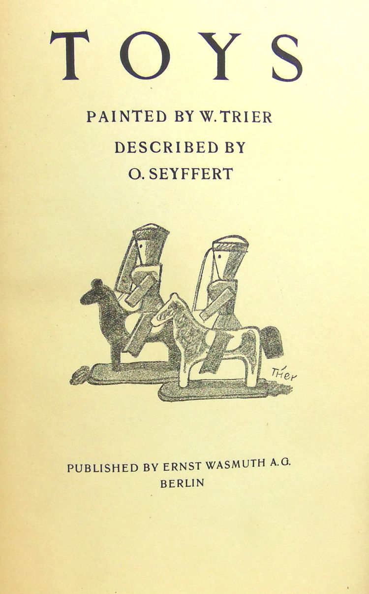 Berlin: Ernst Wasmuth, 1920. 40 chromolithograph plates, heightened by hand, by W. Trier. 1 vols. 8vo. Original yellow boards with illustration by Trier mounted to front cover, rebacked, some cover wear, internally fine. Trier, W. 40 chromolithograph plates, heightened by hand, by W. Trier. 1 vols. 8vo. A delightfully illustrated and sentimental depiction of toys from various regions of Germany.