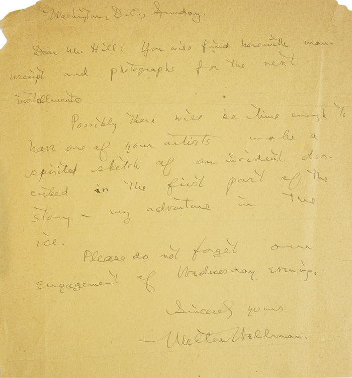 Autograph Letter, signed ("Walter Wellman") to Mr. Hill, submitting a manuscript and photograph for his "adventure in the ice