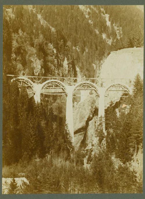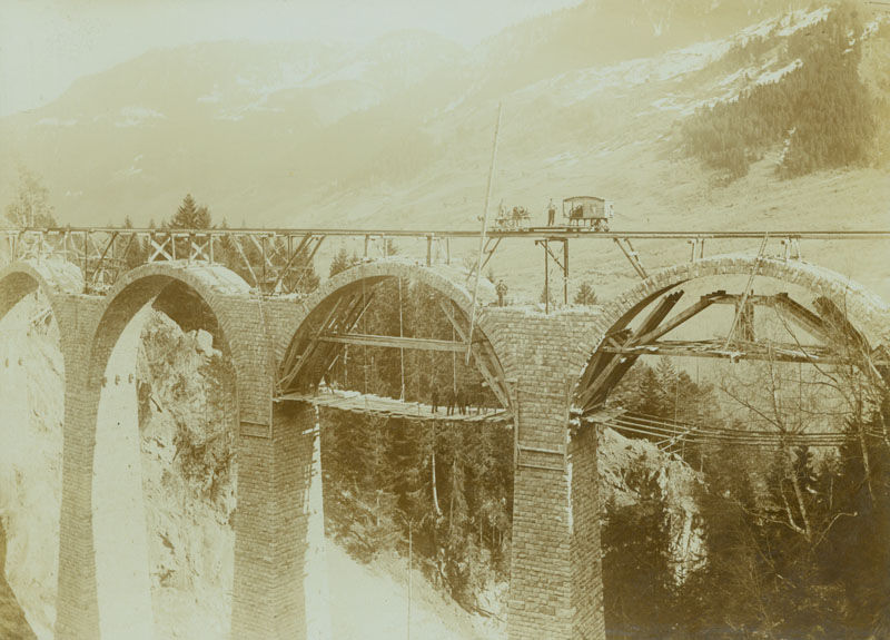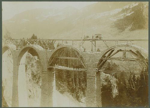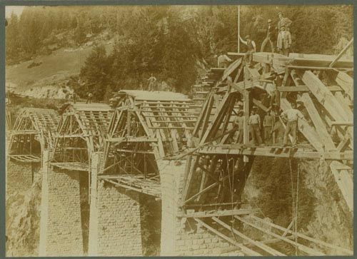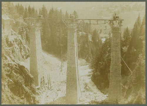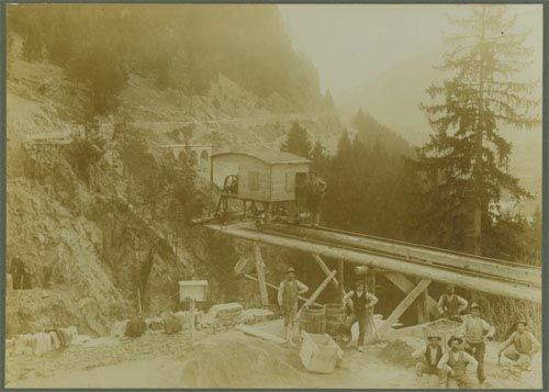 Six Photographs of the construction of an Alpine bridge across a pass in the Swiss Alps