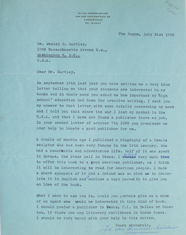 The Hague: 's-Gravenhage, 1959. One and a quarter pages, one page and the synopsis in two pages. 1 vols. 4to. To Wesley Hartley, a long-time educator and teacher, formerly of the American Council on Education. Folded, else fine with two original envelopes. One and a quarter pages, one page and the synopsis in two pages. 1 vols. 4to. ¶The noted historical writer provides more recent biographical information for Hartley. Hartley had enquired how valuable to his creative writing was his formal education. To which he responded that “high school” was certainly important but that he sees “the most important is…the knowledge of humanity, a thorough study of character, of human behavior and certainly I learned a lot during my many travels.” He notes in this earliest letter that he needed an American publisher for his works and asks Hartley if he knows of any good ones that he could provide introductions to. The second letter follows up on this query reminding Hartley of his offer to provide assistance and writing that he had just published a biography of Elizabet Ney, the famous 19th century sculptor who had spent half of her remarkable life in Europe and the other half in Texas. He encloses a synopsis of the work.