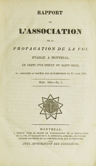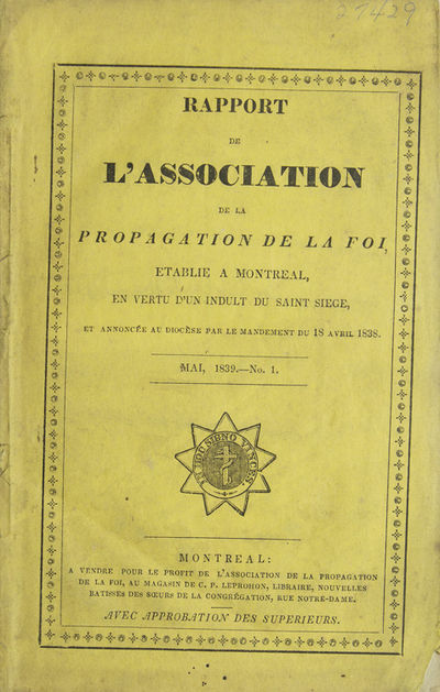 RAPPORT DE L'ASSOCIATION DE LA PROPAGATION DE LA FOI, etablie a Montreal, en vertu d'un Indult du Saint Siege. Number 1