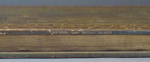 Dublin: Printed for George Mullens, Temple-Bar, 1815. Large Paper Copy. "The present very limited impression of Lord Castlehaven's Memoirs-is taken from the edition of 1684.. Printed by Graisberry and Campbell, 10, Back-lane. xv, [i], 143, [1], 41, [3] pp. Paper: watermarked: CMD 1814. 1 vols. 8vo (9-3/8 x 6-1/2 inches). Green morocco, with gilt three leaf clover cornerpieces and acorn and three leaf clover vine outer border, interior blind-stamped arabesque geometric panel, gilt spine, pink silk doublures, gilt dentelles, a.e.g., signed on fore-edge ... "Bound by Geo. Mullen, Dublin." Bookplate of A.H. Smith Barry. In custom green half-morocco slipcase and chemise. Large Paper Copy. "The present very limited impression of Lord Castlehaven's Memoirs-is taken from the edition of 1684." Printed by Graisberry and Campbell, 10, Back-lane. xv, [i], 143, [1], 41, [3] pp. Paper: watermarked: CMD 1814. 1 vols. 8vo (9-3/8 x 6-1/2 inches).