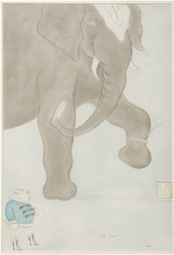 [Rapallo?], 1914. Gouache and wash over pencil, titled and signed "Max" (lower right). 1 vols. 15-1/2 x 10 in. Matted and framed. Gouache and wash over pencil, titled and signed "Max" (lower right). 1 vols. 15-1/2 x 10 in. Lord Northcliffe as Ringmaster training an elephant with '1d' on its head; Northcliffe reduced the price of the Times to one penny in 1914. Provenance: L.J. Cadbury. Literature: History of "The Times" (vol IV (1), 1952); Hart-Davis, no. 1119