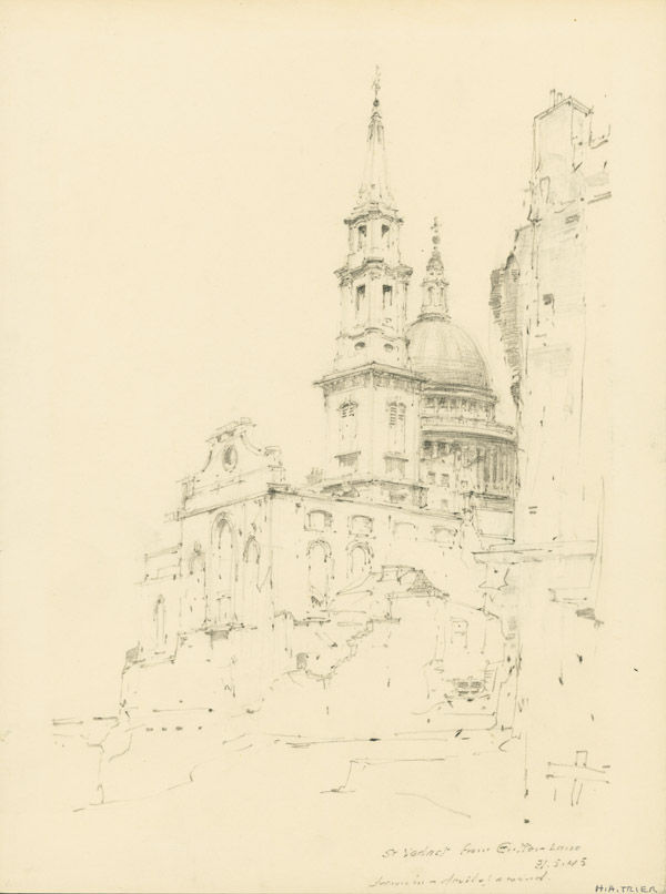 “St. Vedast / from Gutter Lane / 31-5-45 / Drawn in a devil of a wind”: Original pencil rendering of this blitzed London church and surrounding buildings, including St. Paul's in the background, captioned and dated