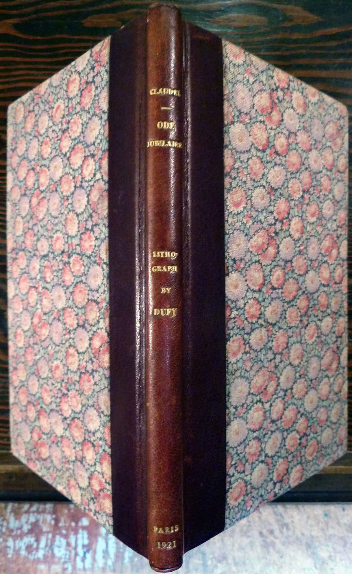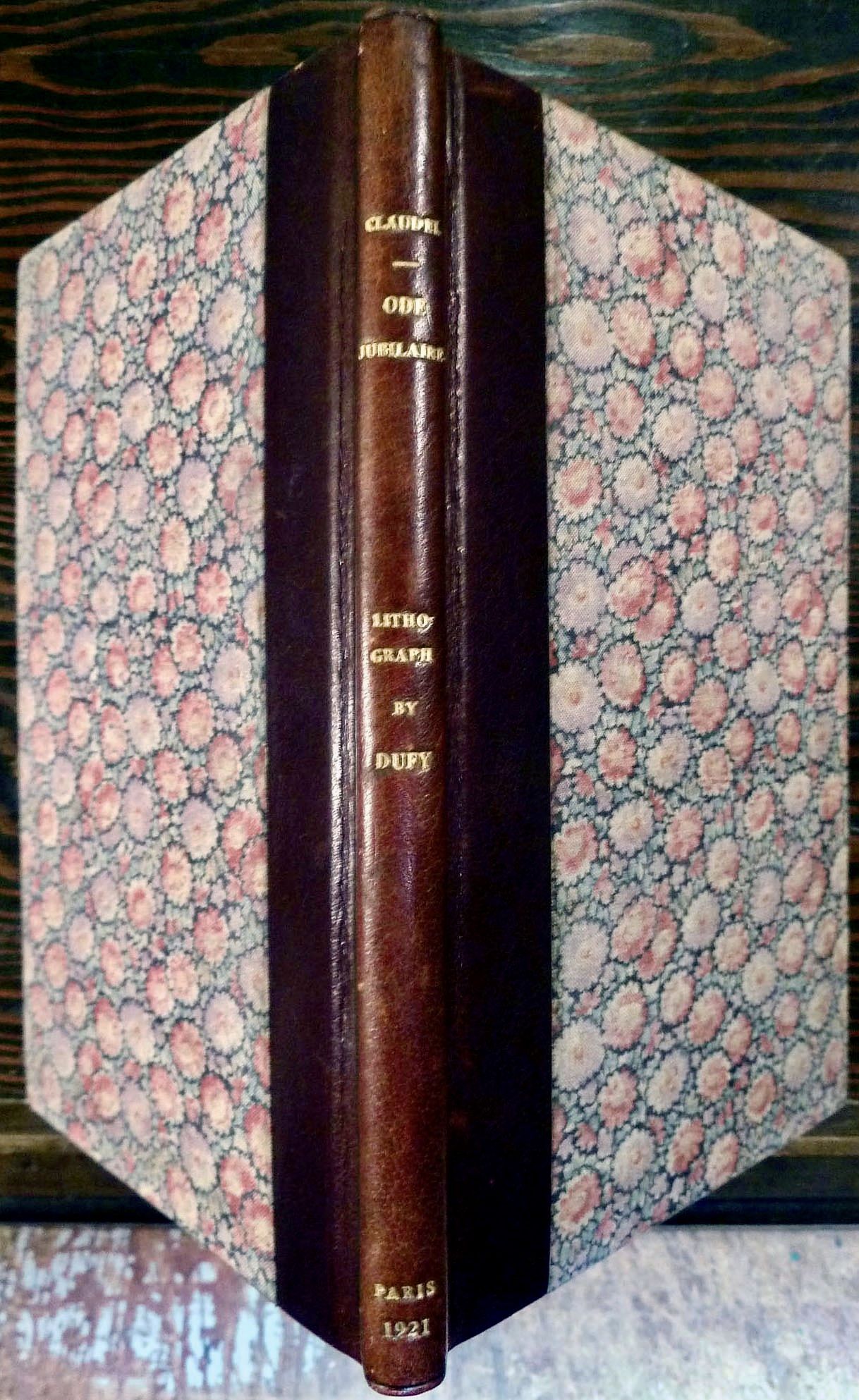 Paris: Nouvelle Revue Francaise, 1921. First edition. Hardcover. Quarter burgundy calf and floral moire cloth, spine lettered in gilt. Fine. Dufy. Raoul. 47 pages in text. 19 x 14 cm. Limited edition, copy 491 of 500 on Arches paper with an original lithograph of Claudel by Dufy. Bound by Alfred Launder, June 1921. Original purple wrappers bound-in. Commemorates the 600th anniversary of Dante's death. Ex-library, Bookplate of Metropolitan Museum of Art on front cover paste-down, and a few very discreet one centimeter on a few blanks, but a pristine copy otherwise. Text in French.