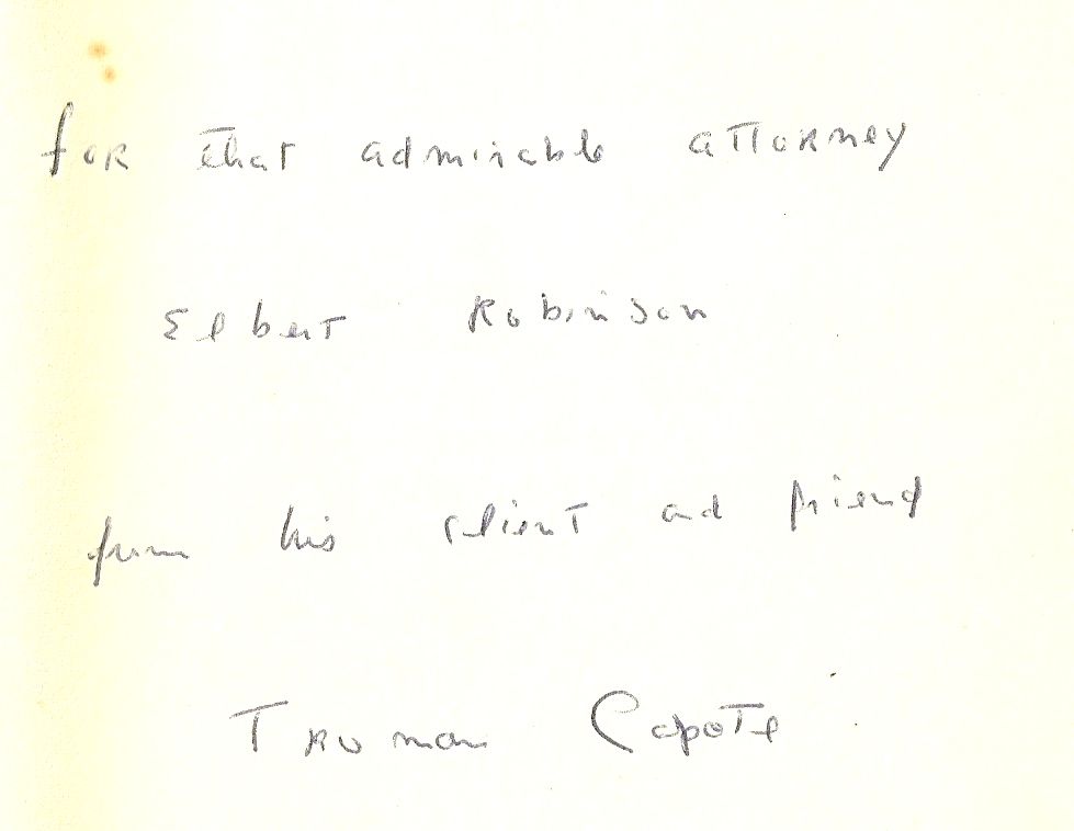New York: Random House, (1965). First Edition. Hardcover. Covers slightly bowed; tape stains to verso of rear endpaper where newspaper clipping, now loose, was once affixed. Mild soiling and light wear to the dustwrapper which has light tape stains to the corners and slightly darker stains to the inside flaps. Near Fine in a Very Good dustwrapper. INSCRIBED and SIGNED by the author to his lawyer on the first blank: "for that admirable attorney/Elbert Robinson/from his client and friend/Truman Capote." Capote's masterpiece, a trendsetting book that opened a floodgate of "nonfiction" novels that has yet to abate. Made into a movie starring Robert Blake.