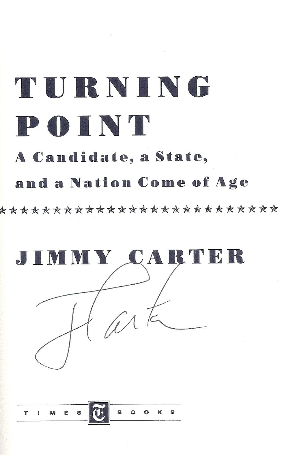 (New York): Times Books, (1992). First Edition. Hardcover. Slight foxing to bulked text edges. Near Fine in a Fine dustwrapper. Carter's story of how he first sought office in 1962 and how he confronted segregation at that time. Illustrated with photographs. SIGNED as "J. Carter" on the title page.