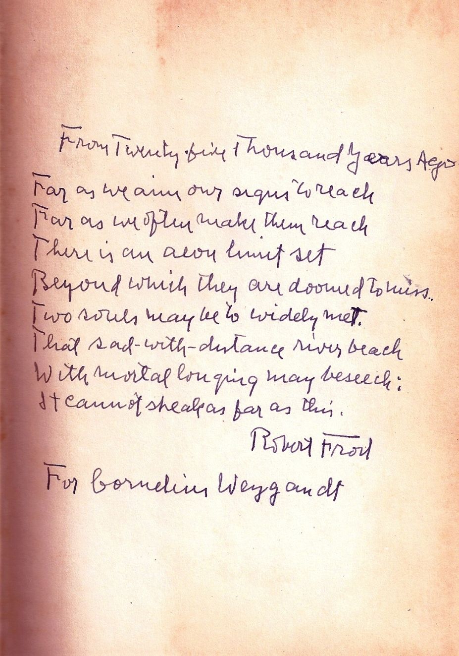 New York: Halcyon House, (1939). First Edition. Hardcover. Fine, lacking the dustwrapper. First Printing of the Halcyon House edition, a near exact reproduction of the Holt edition published a month earlier but without the introduction. INSCRIBED and SIGNED by the author "For Cornelius Weygandt" on the front endpaper with the final eight lines of the final poem in the book under the chapter AFTERTHOUGHT "A Missive Missal" in FROST'S HOLOGRAPH, here titled "From Twenty-five Thousand Years Ago--: "Far as we aim our signs to reach/Far as we often make them reach/There is an aeon limit set/Beyond which they are doomed to miss./Two souls may be to [sic] widely met./That sad-with-distance river beach/With mortal longing may beseech;/It cannot speak as far as this." Frost has omitted what would have been the third line of this section, "Across the soul-from-soul abyss." Weygandt, an English scholar at the University of Pennsylvania, first met Frost in 1915. He is described by Frost anonymously in his poem "New Hampshire" as the man "Who comes from Philadelphia every year/With a great flock of chickens of rare breeds. Weygandt describes his friendship with Frost in THE WHITE HILLS (pages 231-254).