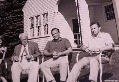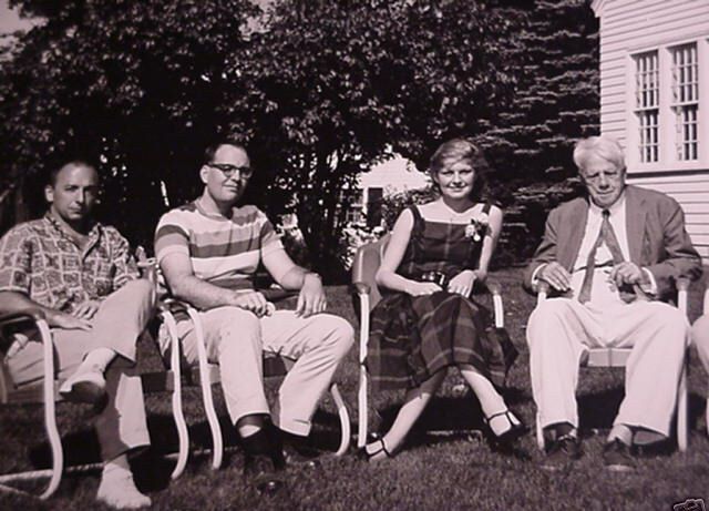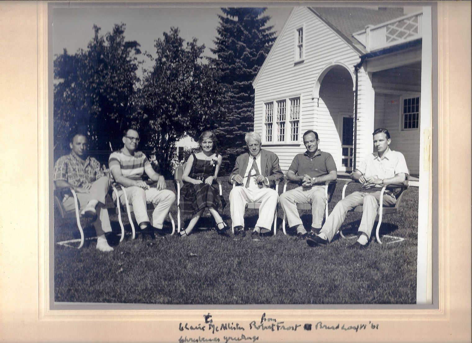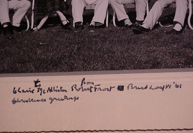 1961. Photograph. About Fine. Vintage 8" x 10" photograph of Frost seated outside a house next to a woman (the recipient?) with two men seated on each side of them, with the stamp of the photographer on the verso: John F. Smith, Jr. of Middlebury, Vermont. Loosely inserted into a mat on which at the bottom is SIGNED and INSCRIBED by the poet: "to Elaine McAllister from Robert Frost Bread Loaf VT '61/Christmas greetings." It is likely that the other seated men are writers and/or teachers at Bread Loaf, but we were unable to identify them.