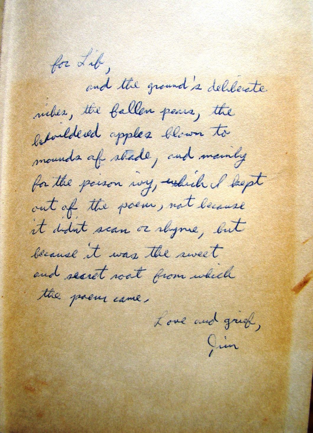New Haven: Yale University Press, 1957. First Edition. Hardcover. Near Fine in a Good dustwrapper, worn but complete but for small chips at the spine tips and corners and a long closed split between the front panel and inside flap. Exceptional Association Copy. Poet's very scarce first book, part of the Yale Series of Younger Poets, with an introduction by W. H. Auden. This copy belonged to Wright's wife, Liberty, with her SIGNATURE at the top of the front free endpaper and below that a SIGNED INSCRIPTION by the poet quoting two lines from a poem in the book, "Eleutheria," and adding a bittersweet, revealing commentary: "for Lib,/and the ground's deliberate/riches, the fallen pears, the/bewildered apples blown to/mounds of shade, and mainly/for the poison ivy, which I kept/out of the poem, not because/it didn't scan or rhyme, but/because it was the sweet/and secret root from which/the poem came./Love and grief,/Jim." Liberty Kardules was Wright's high school sweetheart and the mother of his sons Franz and Marshall. Wright left Liberty two years after publication of this book and divorced her in 1962. Franz Wright is now an accomplished poet. He and his father are the only parent/child pair to have won a Pulitzer Prize in the same category.