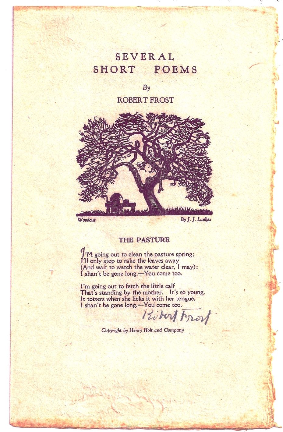 [New York]: Henry Holt and Co., [1924]. First Edition. wraps. Minor and expected soiling, about Fine. J. J. Lankes. Single sheet folded once to make a four page pamphlet printing six poems, including "Stopping by Woods on a Snowy Evening." Illustrated with two woodcuts by J.J. Lankes. Crane A8. Limited to 2000 copies printed for distribution at Frost lectures at East Coast colleges, essentially a give-away item that due to its ephemeral nature is now quite scarce especially when SIGNED by the poet, as this copy is on the front cover beneath the poem "The Pasture."