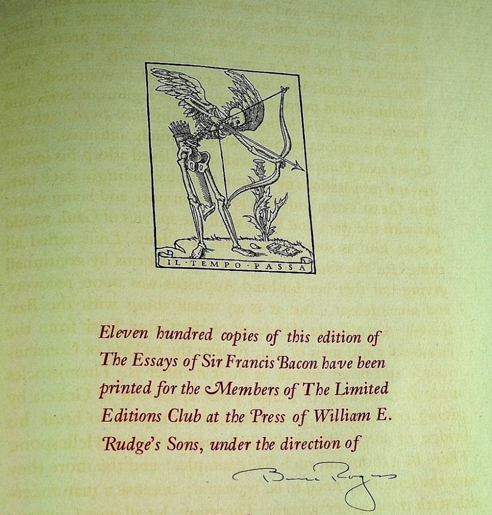New York: Limited Editions Club, 1944. Hardcover. Fine in glassine and about Fine clamshell box. Folio (8-3/4" x 13") bound in half buckram and lovely gold-decorated boards. Introduction by Christopher Morley, note by A. S. W. Rosenbach. Copy #834 of 1100, one of the smaller limitations of the time for the press, designed by Bruce Rogers who has created a lovely presence for these marvelous essays and who has SIGNED the colophon page.