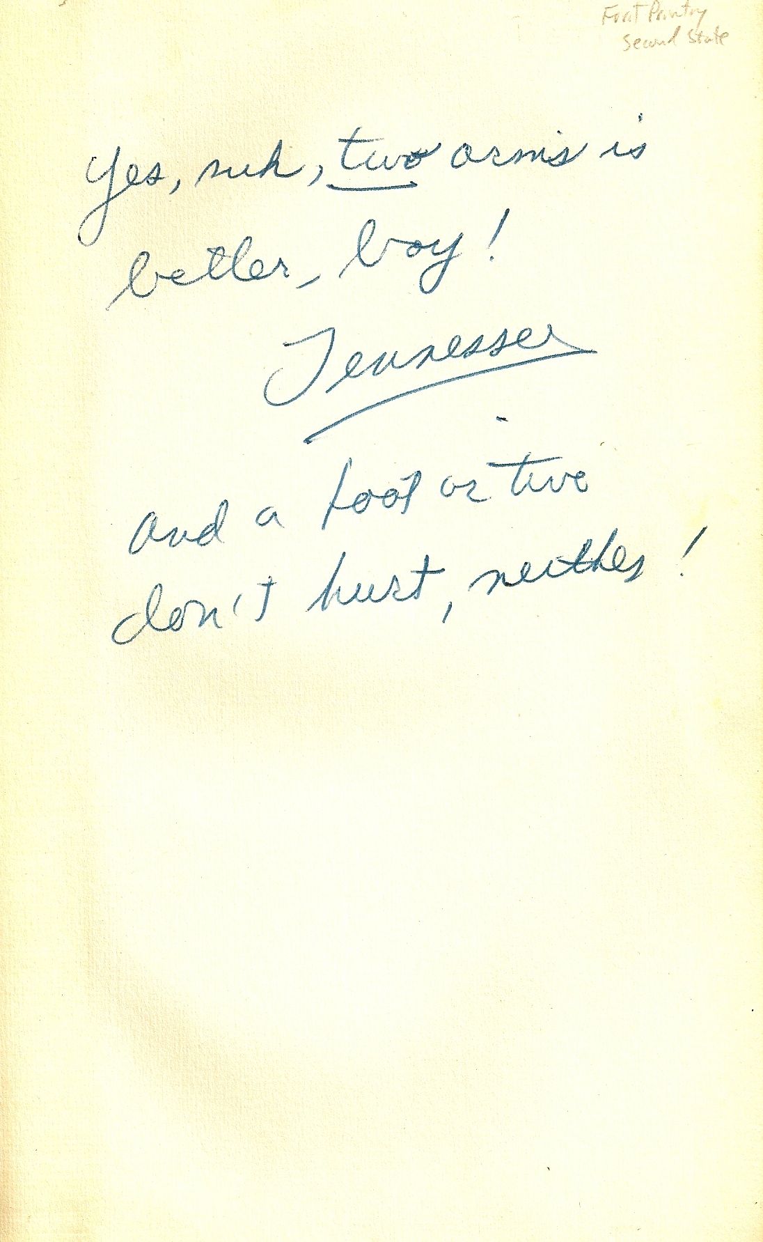 [New York]: New Directions, (1948). First Edition. Hardcover. About Fine in a close to Very Good slipcase with some loss of paper at the very bottom edge and some splitting, but still intact. Cloth-backed decorated boards. Crandell A8.I.a. Second State of the First Printing with the title page on a stub. Less than 50 copies of the first state exist. Interestingly INSCRIBED and SIGNED by the author on the front free endpaper: "Yes, suh, two arms is/better, boy!/Tennessee/and a foot or two/don't hurt, neither!"