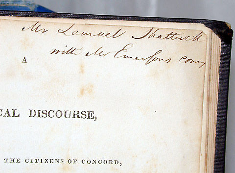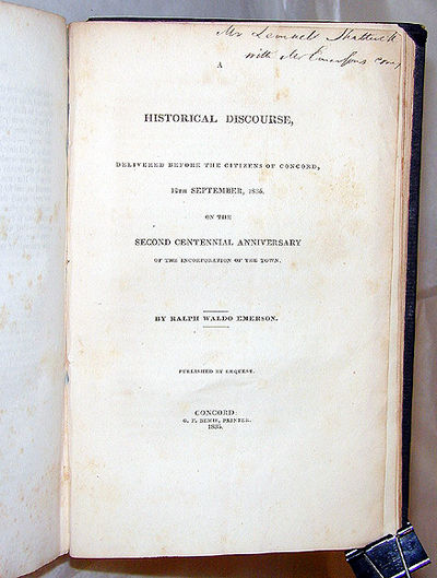 Concord: G. F. Bemis/John Stacy, 1835. First Edition. Hardcover. The Shattuck title page reinforced at the gutter. Near Fine, neatly rebacked retaining the original spine. Original blindstamped publisher's dark brown cloth containing in this order: Shattuck's HISTORY OF CONCORD (viii, 392 pages with folding map); an offprint REVIEW OF A HISTORY OF CONCORD FROM THE NORTH AMERICAN REVIEW, No. XCI (20 pages); and importantly, Emerson's address on the Second Centennial Anniversary of the incorporation of Concord (52 pages), INSCRIBED by the author on the top of the title: "Mr. Lemuel Shattuck/with Mr. Emerson's comp." The end of the final word in the inscription was trimmed and the original blue wrappers discarded when bound with the other two items, the original size 6-7/16" x 9- 3/4" trimmed to 5-1/2" x 8-3/4". BAL 5178; Myerson A2.1: second state with signature mark 3 present, but he notes that the order of states is arbitrary. Emerson's first separately published substantial publication, preceded only by the pamphlet and broadside printings of his 1832 LETTER...TO THE SECOND CHURCH, is scarce not only due to a likely very small printing but also to a fire at the Town-Clerk's office in Concord that is said to have destroyed most copies. He consulted the proof sheets of Shattuck's history, published shortly after the town's celebration, in creating this work, referring to it in 23 footnotes. The strong circumstantial evidence leads us to believe this is Shattuck's own copy of his work and the offprint as well, bound together for him with the pamphlet given to him by Emerson. Bookplate of the Reverend Philip Wheeler on the front pastedown.