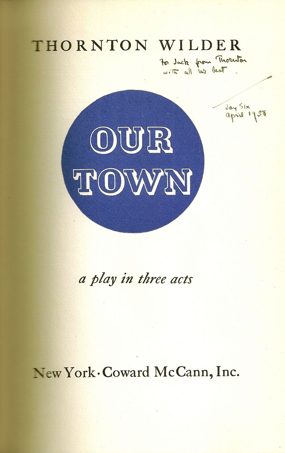 New York: Coward-McCann, Inc., (1938). First Edition. Hardcover. Tight, crisp copy with the typical mild sunning along the cloth edges; bookplate of someone named Comstock on the front pastedown hidden by the inside dustwrapper flap. The dustwrapper is complete but for a small chip at the heel of the spine affecting the last two letters of "Coward" and "McCann." Other than that there are just a few scrapes to the rear panel and light edgewear. Near Fine in a Very Good dustwrapper. Winner of the Pulitzer Prize for Drama and a touchstone of American theater. After reading this play, Albert Einstein wrote a letter to Wilder comparing OUR TOWN to Homer's ODYSSEY and Shakespeare's HAMLET, stating: "That an American of the present day can create with such delicacy and detachment touches the soul like a miracle." This copy is INSCRIBED and SIGNED by the author upon publication on the title page: "For Jack from Thornton/with all his best/Jay Six/April 1938." Jay Six was a ranch in southeast Arizona that Wilder frequented. Two years prior, in 1936, John Fitzgerald Kennedy and his older brother Joe had their first paying jobs at the ranch. Alas, THAT Jack was not there in 1938.