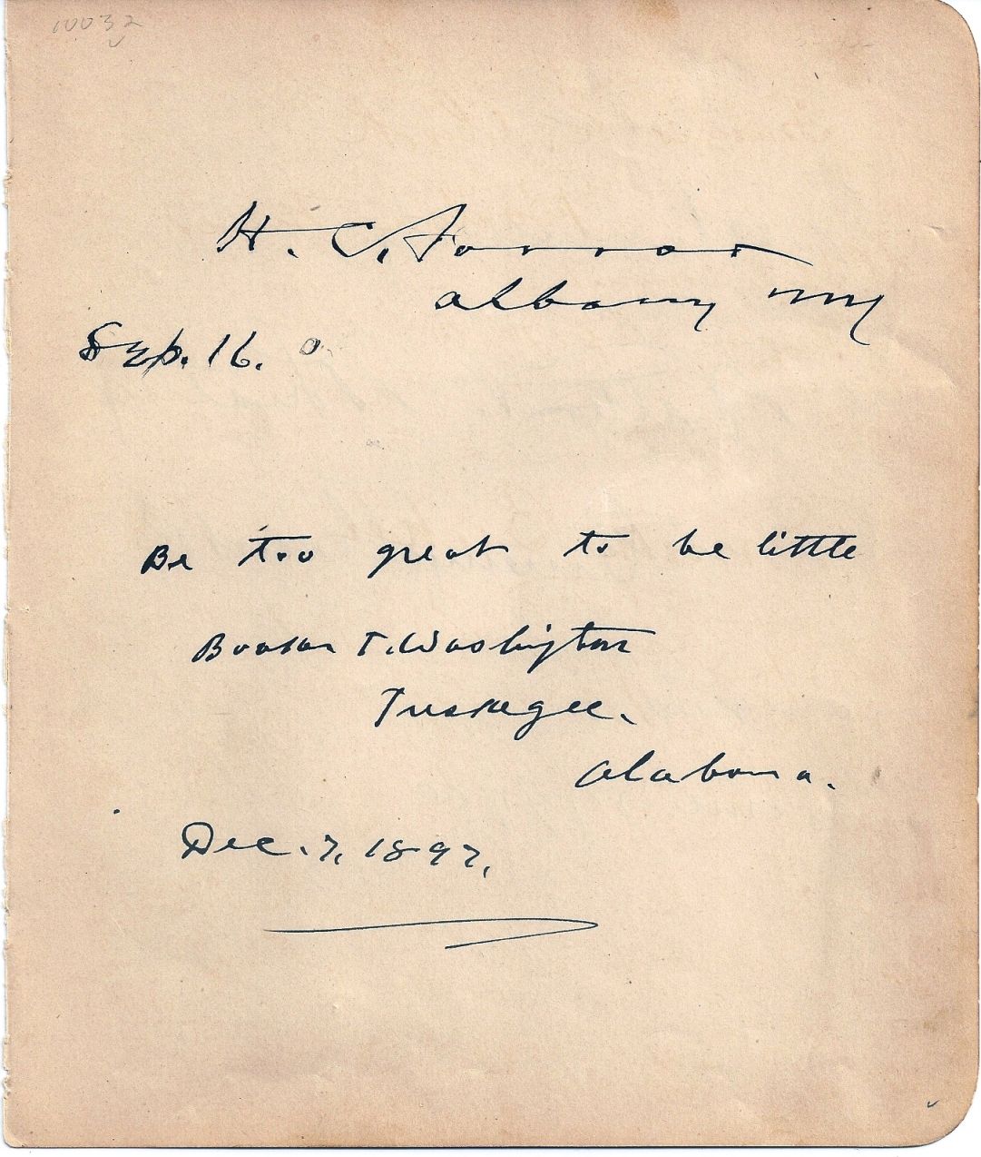 Tuskegee, AL, 7 Dec. 1897. Autograph. Mild aging of paper. About Fine. A fine quote--"Be too great to be little"--on a 6-1/2" x 8" page removed from an autograph album SIGNED and dated by Washington in Tuskegee. The verso bears an unknown signature as does the top of the page that Washington has signed, but this could be easily removed or matted over. A wonderful display piece.