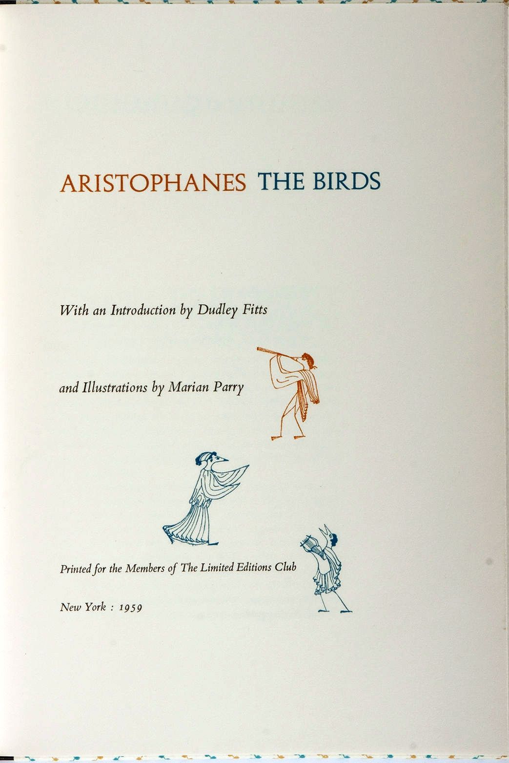 New York: Limited Editions Club, 1959. Hardcover. Tasteful bookplate on the front pastedown. Fine in a Fine chemise and lightly soiled slipcase. Marian Parry. Quarto (7-7/8" x 11") bound in classic parchment with decorations in ochre and blue with a polished black calf spine; 72 double-folded pages. Translated from the Greek and with an introduction by Dudley Fitts. Illustrated with pen-and-ink drawings by Marian Parry. Copy #39 of 1500 numbered copies SIGNED by the illustrator on the colophon page.