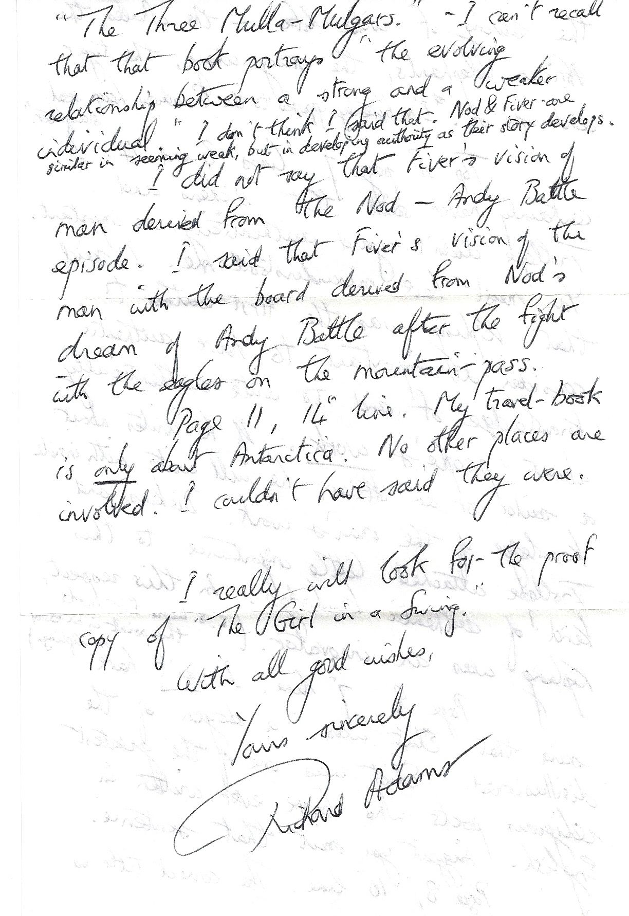 Mountain View, CA, 5 Jan. 1982. Letter. Crease marks from folding. With original envelope. Near Fine. AUTOGRAPHED LETTER SIGNED of 4 pages. About personal matters but primarily concerned with making corrections in an interview eventually published in the WEBSTER REVIEW in 1985. Adams mentions Kipling, Dickens, Trollope, and others, as well as his being president of the British Royal Society for the Prevention of Cruelty to Animals. Regarding his WATERSHIP DOWN and a character from De la Mare's THE THREE MULLA-MULGARS, Adams says, "Nod & Fiver are similar in remaining weak, but in developing authority as their story develops. I did not say that Fiver's vision of man derived from the Nod-Andy Battle episode...." Along with a copy of the magazine containing the interview, copies of the interviewer's letters to Adams, and two copies of the manuscript of the interview--one the final copy and the other with some questions and answers not used in the final version.