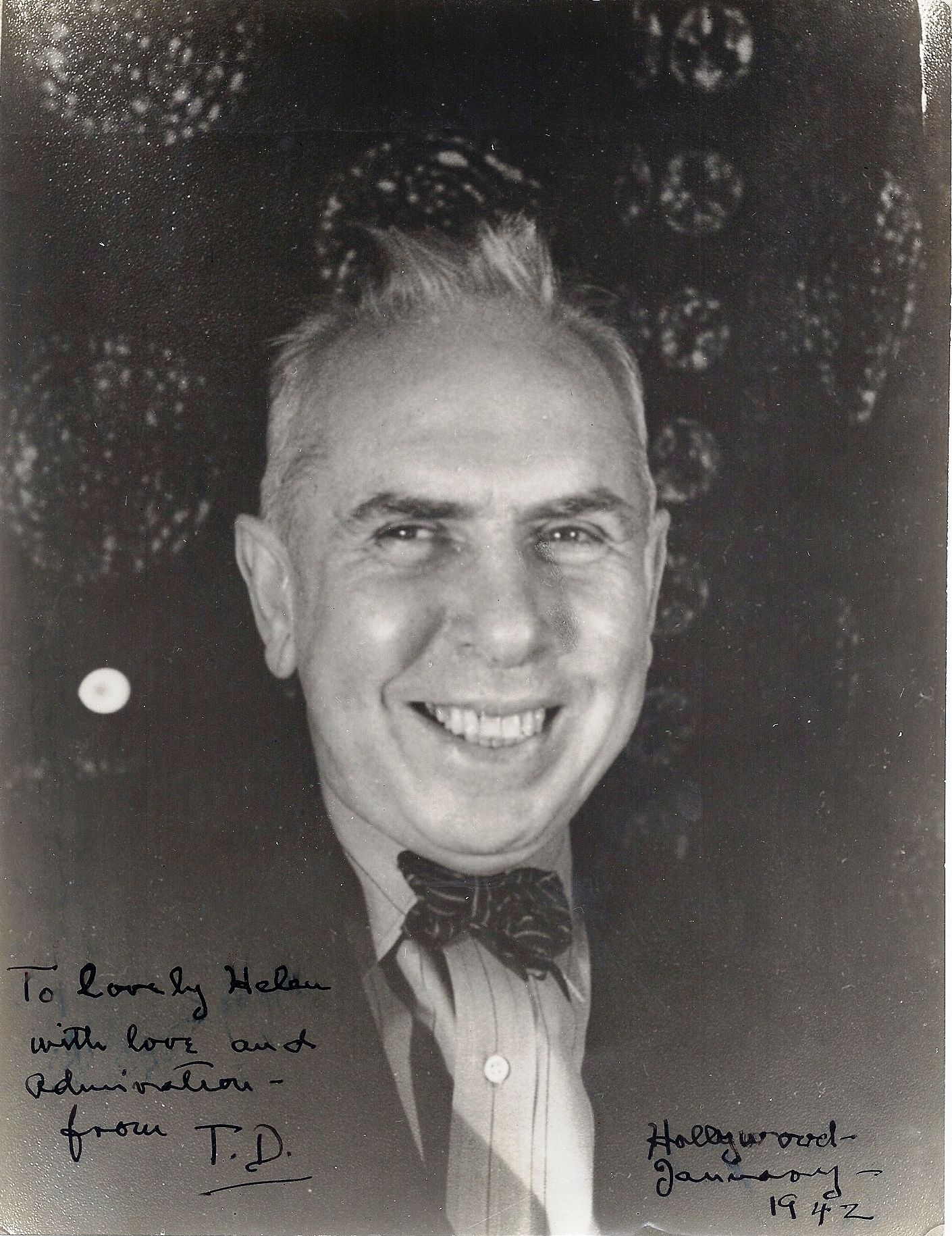 Photograph. About Fine with a superb association. A fine 7" x 9-1/4" informal photographic "head shot" portrait by Carl Van Vechten of a seventy-year old Dreiser with a smile bordering on a laugh. INSCRIBED and SIGNED at the bottom with fine contrast: "To lovely Helen/with love and/admiration-/from T.D./Hollywood/January--/1942." Helen Richardson first met Dreiser in 1919 and married him in 1944. Dreiser left his entire estate to her in his will and, after her death in 1955, she was buried next to him. In 1942, however, Dreiser and Helen were often apart with Dreiser often romantically involved with another woman. Just a few months after inscribing this photograph to his future wife, Dreiser had an eleven-day fling with one of his ardent female admirers. Still, Dreiser's inscription captures the great feeling he had for Helen from the beginning. W. A. Swanberg in his biography DREISER sums up well their relationship: "Although he still threatened at times to leave her, Dreiser needed Helen for survival, Helen knew that he needed her, and he knew that she knew" (p. 478).