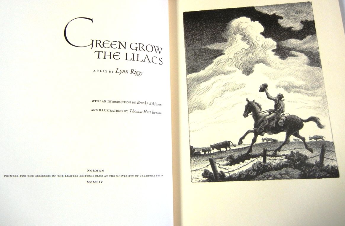 Norman [OK]: Limited Editions Club, 1954. hardcover. Near Fine in a Near Fine slipcase with some soiling. Thomas Hart Benton. Quarto (9" x 12") bound in boards covered with a heavy canvas and stamped with the title drawn by Will Ransom and with a special drawing by Thomas Hart Benton; 160 pages. Printed in red and black from the typographic plans of Will Ransom on a specially made paper "Oklahoma corn" in color. Contains a new introduction by Brooks Atkinson. Basis for the Rodgers and Hammerstein musical OKLAHOMA!. This version is beautifully illustrated with 8 full-page lithographs drawn on the stone by Thomas Hart Benton and printed by George C. Miller. Copy #169 of 1500 SIGNED by the artist on the colophon page. Monthly Letter laid in.