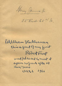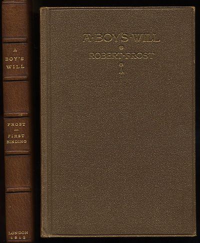 London: David Nutt, 1913. First Edition. Hardcover. A spectacular copy with an exceptional association. Original bronzed brown pebbled cloth, gilt-lettered on the front cover. Crane A2: First Issue, Binding A of Frost's first book. Less than 350 copies of the first issue in the first binding were issued, from a total edition of 1,000. INSCRIBED and SIGNED by the author on the front endpaper: "To William Stockhausen/this a first of my first/Robert Frost/and pleased to meet it/again so fresh after all/these years/Dec 26 1960." In addition on the front endpaper is the pencil ownership signature of Henry James, Jr. with a 55 East 65th St. address. According to the SOTHEBY PARKE BERNET catalog of THE WILLIAM E. STOCKHAUSEN COLLECTION, 1974, "this copy is most certainly from the library of Henry James the novelist. The owner name is in the hand of his nephew Henry James but appears to be an identification of source. The nephew inherited a large part of the novelist's library on the author's death in 1916. He never used either Jr. or Henry James II but his uncle did use the latter. Since this is evidently not his own ownership inscription it appears to be more than likely that he wrote it to identify those books which had come from his uncle's library." A copy of NORTH OF BOSTON also inscribed to Stockhausen had a similar ownership signature. This copy of A BOY'S WILL was last on the market in 1977, and a letter from the well-known bookseller to the buyer is laid in. Housed in a cloth chemise and handsome brown morocco-backed cloth slipcase.