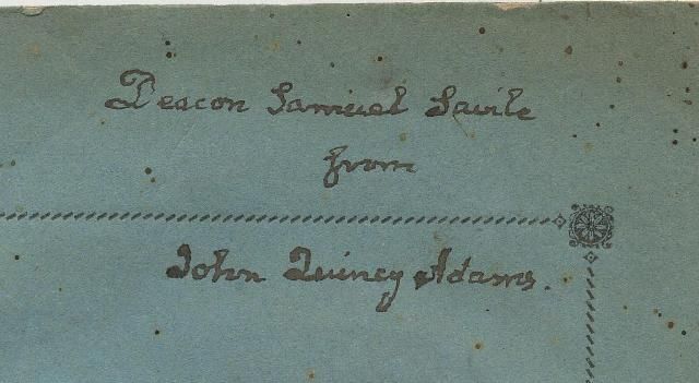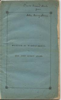 Newburyport: Morss and Brewster, (1837). First Edition. wraps. Very Good and scarce. Original printed blue wrappers; 68 pages. INSCRIBED and SIGNED on the front blue wrapper: "Deacon Samuel Savile/from/John Quincy Adams." Books inscribed by Adams are quite uncommon, and when found are usually signed on a presentation slip pasted in rather than in the actual pamphlet or book as it is here. The first child of a president to become a president, the first president to be a published poet, and the first president to be photographed, Adams was certainly one of our most intelligent presidents and one of the greatest humanitarians to hold that office. He is also the only president to serve in Congress after leaving office and is perhaps best known for two accomplishments outside his term: the authorship of the Monroe Doctrine as secretary of state and his heroic, successful argument before the Supreme Court to free the Amistad slaves. This oration is of particular interest as it was given on 4 July 1837 to commemorate the 61st anniversary of the Declaration of Independence, a document his father was assigned to draft, though he left that task to Thomas Jefferson. Adams Sr. and Jefferson were the only presidents to sign the Declaration. In this speech Adams refers to the injustice of slavery several times connecting it to the promise of the Declaration of Independence and "a rule of right transcending all human power ... must lead to the extinction of slavery and of war from the earth." Adams and Savile were members of the First Congregational (Unitarian) Church in Braintree, Massachusetts.