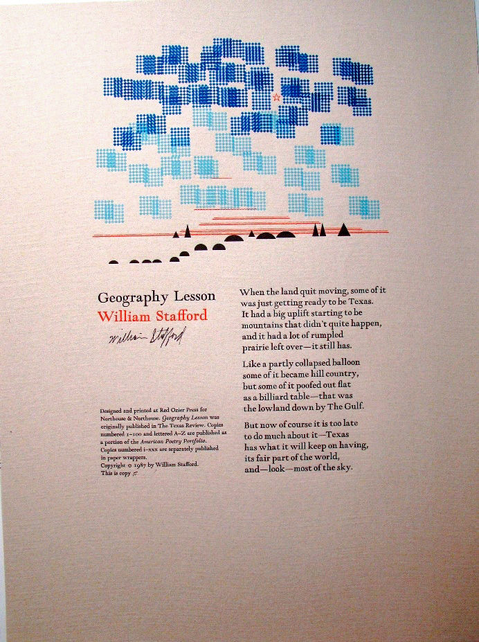 Dallas: Northouse & Northouse, 1981. First Edition. broadsides. Fine in case as issued. A collection of 8 folio broadsides and title page ranging in size from 13" x 17" to 13" x 19" and printed on heavy paper of various colors with all but two of the broadsides illustrated and each individually SIGNED by the author. This is Copy "F" of 26 lettered copies of a total edition of 126. Contributors are John Updike ("Two Sonnets"), Allen Ginsberg ("Capitol Air" - - Ginsberg has also made a single word holograph correction to the text), Linda Pastan ("Mother Eve"), Howard Nemerov ("Landscape with Self-Portrait"), Heather McHugh ("From 20,000 Feet"), William Stafford ("Geography Lesson"), William Heyen ("Mother and Son"), and Scott Davison ("Soft Salvation"). The five printers are The Red Ozier Press, The Meadow Press, The Press of A. Colish, The Press of W. Thomas Taylor, and the Wind River Press. Housed in a plexiglass box especially made for this publication and allowing the portfolio to be hung on a wall with one of the broadsides displayed.