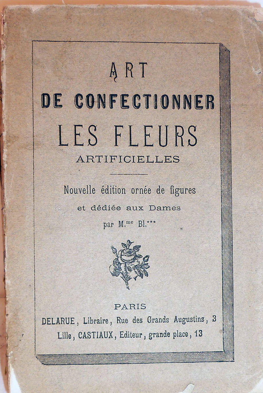 Paris: Delarue, 1850. Original Wraps. Orig. printed light gray wrappers chipped with slight loss at one lower corner (front cover) and one upper corner (back cover). Very good.. 272 pages in text. 15 x 10 1/2 cm. 25 numbered full-page plates (some double-paged), plus 32 supplemental plates numbered A-Z, AA-FF, with additional plates and illustrations within the text - all in black and white. Text in French, interior clean, initial decorated letters, Glossary of Principal Terms. Practically speaking, artificial flowers differed only in a single feature -- whereas real flowers wilt, 18th and 19th century cloth, paper or wax blooms were relatively imperishable. In the Victorian era artificial flowers were ubiquitous, a woman's garland for all seasons including her death. Initially fashioning flowers was considered an art and craft explicitly reserved for genteel women. Ex-library, internal marking only, discreet one centimeter round on verso of some plates.