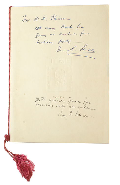 New York, 1963. Printed programme with four-page announcement, menu, and 7-page guest list. 1 vols. 4to. White wrappers backed with red, covers embossed with images of Time magazine, tied with rose cord. Inscribed on front cover. About fine. Printed programme with four-page announcement, menu, and 7-page guest list. 1 vols. 4to. Inscribed on the front cover, “For W. H. Thiessen, with many thanks for giving us such a fine birthday party — Henry R. Luce”