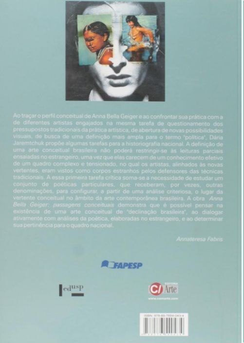 Belo Horizante: EDUSP; C/Arte; FAPESP, 2007. b/w, duo tone and color plates, ports., tbls., visual poetry, cat., facs., bibl. (p. 136-147), color pict. fldg. wrps. The conceptual works of Anna Bella Geiger are the focus of this study. Beginning in the 1960s, her works are characterized for her ideas questioning the nature of art and its system. The artist also deals with ideological order conflicts and politics of Brazilian history as she experienced it. Her key themes of work cover education, the aboriginal question and the formation of a proud national identity, and the military regimen. The form and the presentation of these objects seek participation of the public. Anna Bella contribution to contemporary art in Brazil has been significant. She has bequeathed an approach between the artistic field and other areas of human production that include ethical, historical, social, economic tensions, and artistic politics. This study includes her extensive work on: artists books, experimental art, video art, installation art and more. An extensive bibliography is included. It is based on the doctoral thesis of the author completed in 2004.