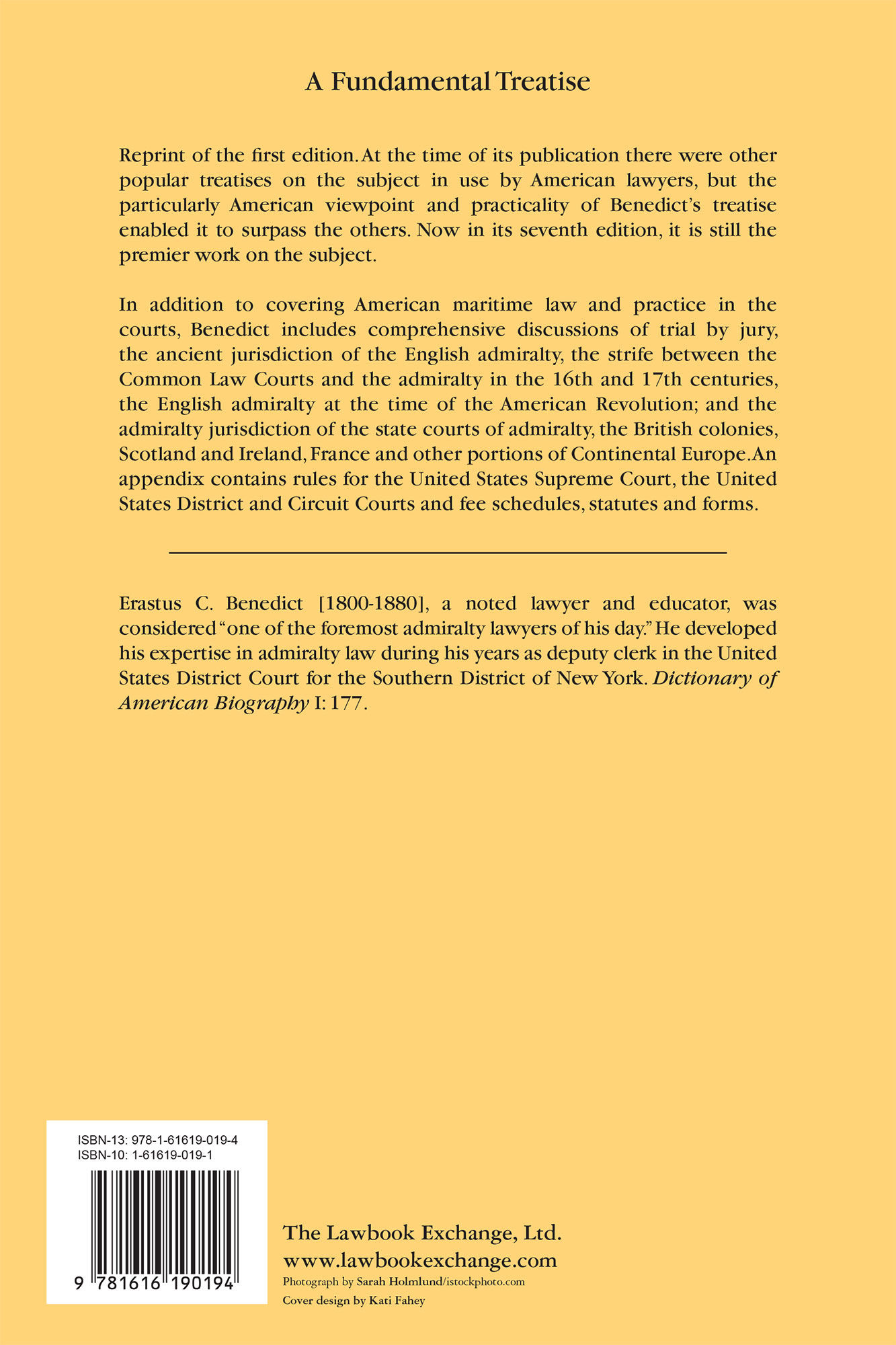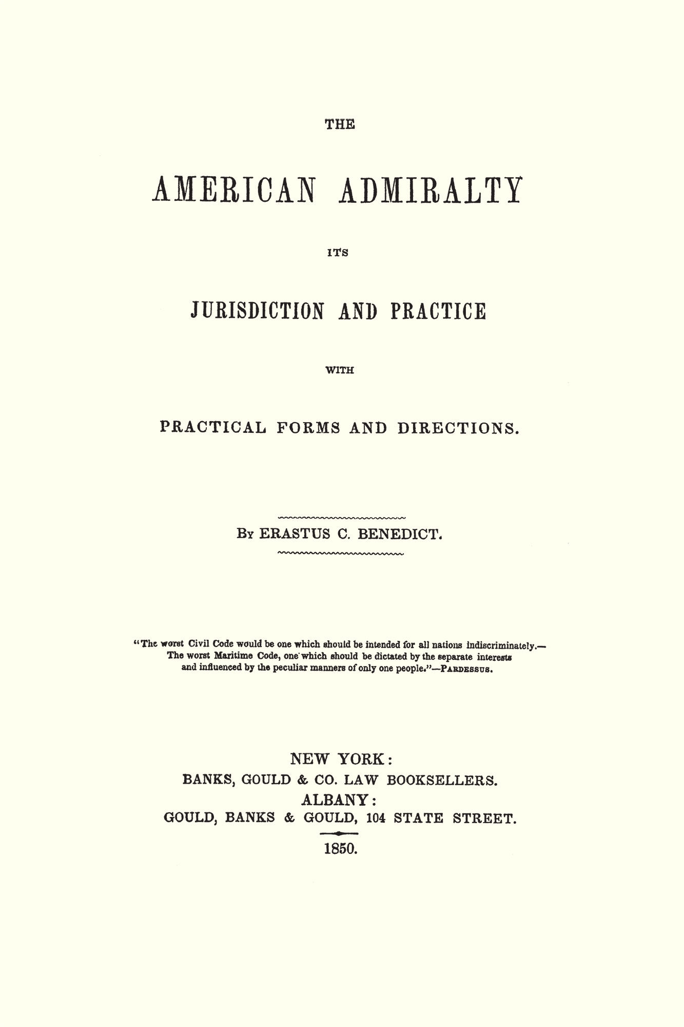 2010. ISBN-13: 9781616190194; ISBN-10:1616190191. Benedict, Erastus C. The American Admiralty: Its Jurisdiction and Practice with Practical Forms and Directions. Originally published: New York: Banks, Gould & Co., 1850. xiii, 651 pp. Reprinted 2010 by the Lawbook Exchange, Ltd. ISBN-13: 9781616190194; ISBN-10:1616190191. Paperback. New. $39.95 * Reprint of the first edition. At the time of its publication there were other popular treatises on the subject in use by American lawyers, but the particularly American viewpoint and practicality of Benedict's treatise enabled it to surpass the others. Now in its seventh edition, it is still the premier work on the subject. In addition to covering American maritime law and practice in the courts, Benedict includes comprehensive discussions of trial by jury, the ancient jurisdiction of the English admiralty, the strife between the Common Law Courts and the Admiralty in the 16th and 17th centuries, the English admiralty at the time of the American Revolution; and the admiralty jurisdiction of the state courts of admiralty, the British colonies, Scotland and Ireland, France and other portions of Continental Europe. An appendix contains rules for the United States Supreme Court, the United States District and Circuit Courts and fee schedules, statutes and forms. Benedict [1800-1880], a noted lawyer and educator, was considered "one of the foremost admiralty lawyers of his day." Dictionary of American Biography I: 177.