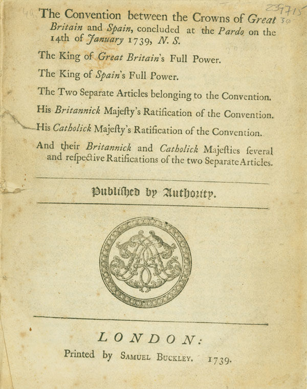 The Convention between the Crowns of Great Britain and Spain, concluded at the Pardo on the 14th of January 1739, N.S. The King of Great Britain‘s Full Power. The King of Spain’s Full Power. The Two Separate Articles belonging to the Convention. His Britannick Majesty’s Ratification of the Convention. His Catholick Majesty’s Ratification of the Convention. And their Britannick and Catholick Majesties several and respective Ratifications of the two Separate Articles. Published by Authority