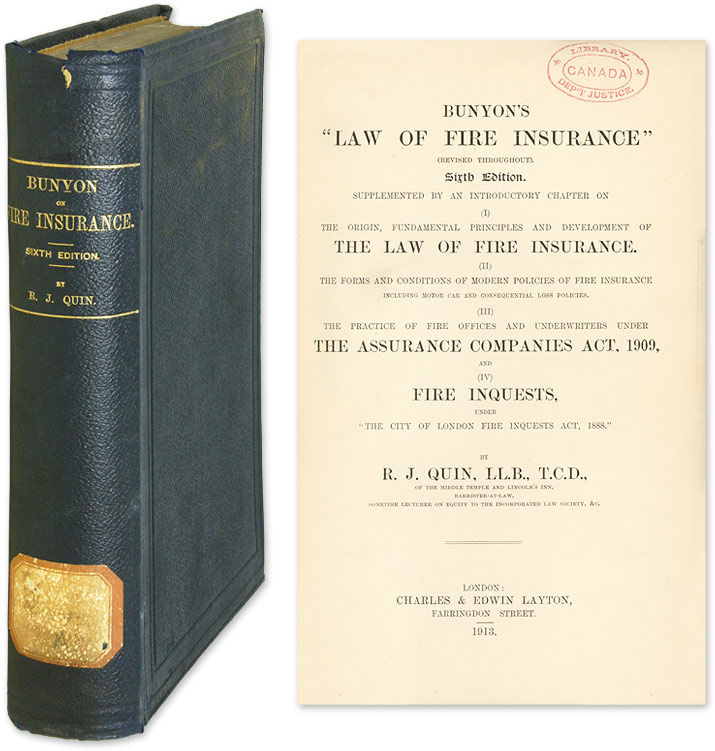 1913. Bunyon on Fire Insurance Bunyon, Charles John. Quin, R[ichard] J[ames], Editor. Bunyon's "Law of Fire Insurance" (Revised Throughout). Sixth Edition. Supplemented by an Introductory Chapter on I. The Origin, Fundamental Principles and Development of the Law of Fire Insurance. II. The Forms and Conditions of Modern Policies of Fire Insurance Including Motor Car and Consequential Loss Policies. III. The Practice of Fire Offices and Underwriters Under the Assurance Companies and IV. Fire Inquests Under "The City of London Fire Inquests Act, 1888." London: Charles & Edwin Layton, 1913. lxxxv, 424, cxxvii pp. Original textured cloth, blind frames to boards, gilt title to spine. Some shelfwear, front free endpaper detached, rear hinge cracked but secure, internally clean. Ex-law library. Location label to foot of spine, stamps to endleaves and title page. $125. * Sixth edition. First published in 1867, this venerable treatise reached in seventh and final edition in 1923. Sweet & Maxwell, A Legal Bibliography of the British Commonwealth 2:49.