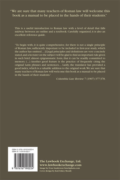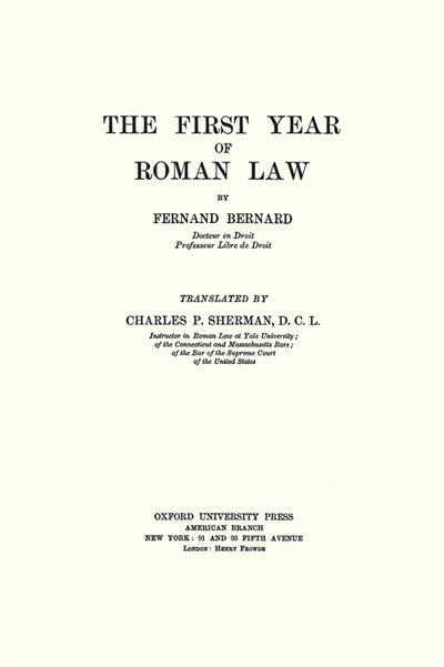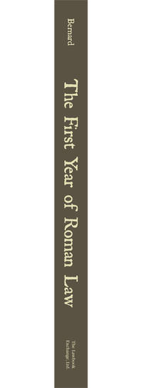 2010. ISBN-13: 9781616190224; ISBN-10: 1616190221. Useful Introduction to Roman Law Bernard, Fernand. The First Year of Roman Law. Translated by Charles P. Sherman. Originally published: New York: Oxford University Press, 1906. xiii, 326 pp. Reprinted 2010 by The Lawbook Exchange, Ltd. ISBN-13: 9781616190224. ISBN-10: 1616190221. Paperback. New. $24.95. * This is a useful introduction to Roman law with a level of detail that falls midway between an outline and a textbook. Carefully organized, it is also an excellent reference guide. "To begin with, it is quite comprehensive, for there is not a single principle of Roman law, sufficiently important to be included in first-year study, which the author has omitted.... [L]egal principles and definitions are very concisely stated, and a lecturer on the subject will be glad to find an important rule given in such brief, almost epigrammatic form, that it can be readily committed to memory. (...) Another good feature is the practice of frequently citing the original Latin phrases and sentences.... Lastly, the translator has provided a good index, which is a valuable addition to the original work. We are sure that many teachers of Roman law will welcome this book as a manual to be placed in the hands of their students.": Columbia Law Review 7 (1907) 377-378.