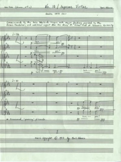 Signed and dated New York, Jan-April 1997. Supreme Virtue was commissioned by the Dale Warland Singers with the support of the Jerome Foundation and the Alice M. Ditson Fund of Columbia University. The Dale Warland Singers premiered the work in Minneapolis in June 2000. The text consists of an English translation by Stephen Mitchell of verses from the "Tao te Ching." It was first recorded by the Seattle-based chamber choir Esoterics on the Terpsichore label in the winter of 2008.