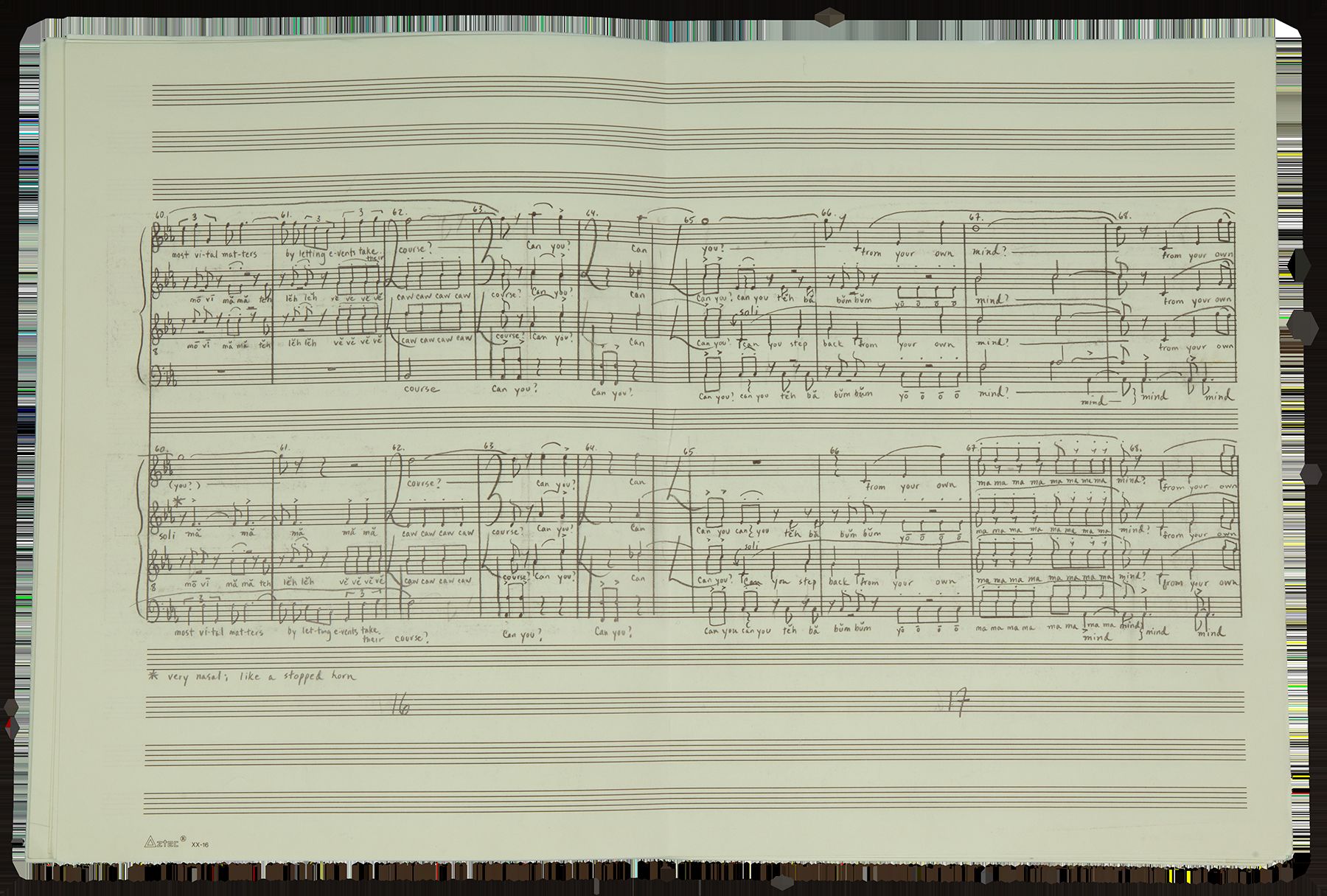 "For a few years I was the tenor section leader of a choir in Washington, and in singing with and composing for them I'd become more and more interested in the quasi-instrumental vocal gesture. Stephen Mitchell's pellucid translation of this verse of the Tao te ching - a series of moral challenges all beginning with the words "Can you?" - spurred me to explore this idea at length. The singers, divided into two SATB choirs, intone the first question in a dusky C-minor against a sighing backdrop of wind sounds: then, as the first choir utters the text's first challenge, the second choir refracts their words into marimba-like repeated notes, as if the long lines of the first choir were subjected to a kind of aural strobe. As the questions become tougher, so do the sounds: tenors and altos stab into the texture with horn-like interruptions, and the phrase "Can you?" disrupts the unwavering four-four pulse with insistent threes and twos. At a peak of intensity, a looping soprano-alto line spirits us away from pulse and chord, leading first to a melodic meditation based on the vowels of "Can you?" and then to a cadenza, in which chords appear and vanish into a shimmering, ever-present curtain of sound. A vision of equanimity is intoned in the open fifths of (both Western and Eastern) chant: then, as if elated by its discovery ("this is the supreme virtue") the chorus reworks its "Can you?" motive: a nudging half-step expands to a whole step, the harmony brightens to B-flat, and, in rhythms now more jubilant than insistent, the score spins to closure." Mark Adamo website.
