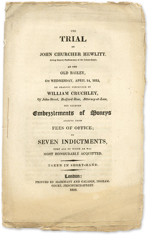 1813. Scarce English Embezzlement Trial [Trial]. Hewlitt, John Churcher, Defendant. The Trial of John Churcher Hewlitt, Acting Deputy Prothonotary of the Place-Court, At the Old Bailey, On Wednesday, April 14, 1813, on Charges Preferred by William Cruchley, Of John-Street, Bedford-Row, Attorney-at-Law, For Alleged Embezzlements of Moneys Arising from Fees of Office; On Seven Indictments, Upon All of Which he was Most Honourably Acquitted. Taken in Short-Hand. London: Printed by Marchant and Galabin, 1813. [ii], 16 pp. Octavo (9" x 5-1/2"). Stab-stitched pamphlet. Light browning, several leaves unopened, internally clean. $450. * Only edition. Hewlett was accused of embezzlement by his employer, Cruchley. This appears to be a vindication of Hewlitt's honor and innocence. It may have been published at his expense or urging. OCLC locates 4 copies in North America, 2 in law libraries (Harvard and Social Law).