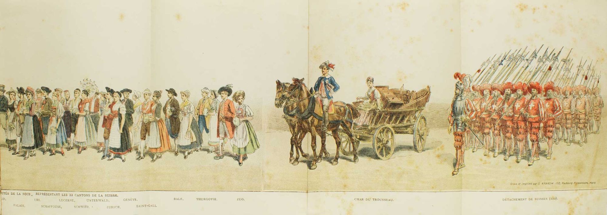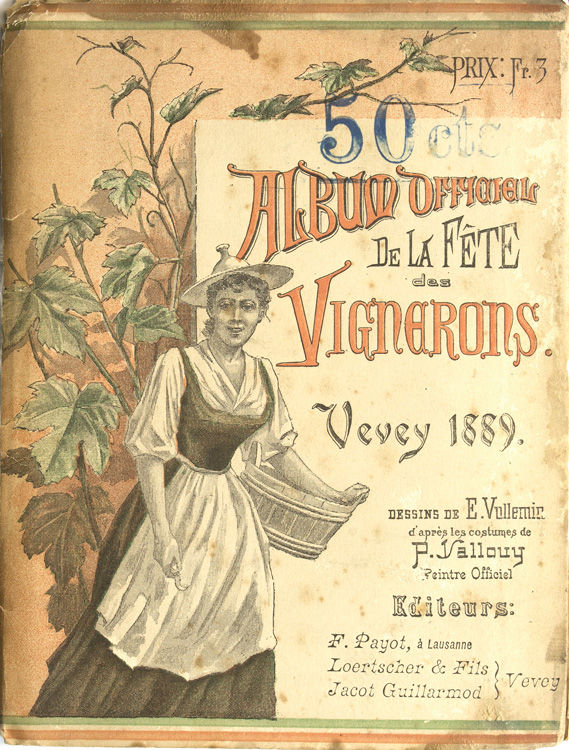 Vevey: Loertscher & Fils, Jacot Guillarmod; F. Payot a Lausanne, 1889. 24 colored folding accordion plates (each plate is 250 x 150 mm, with legend below). Dessins de E[rnest John Alexis] Vullermin d'après les costumes de P[aul Aimé] Vallouy. 1 vols. 12mo. Pictorial wrappers. Prix: Fr.3. and also with stamp 50 cts. Some staining, else Very Good. 24 colored folding accordion plates (each plate is 250 x 150 mm, with legend below). Dessins de E[rnest John Alexis] Vullermin d'après les costumes de P[aul Aimé] Vallouy. 1 vols. 12mo. Souvenir of wine harvesting in the Swiss town of Vevey.