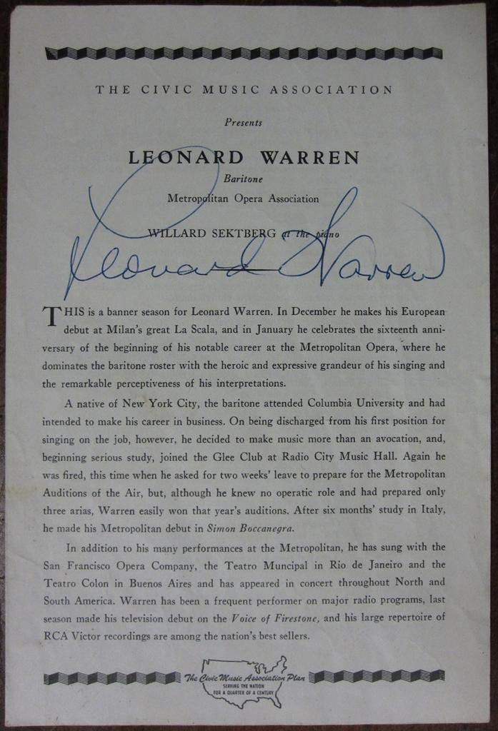 Baritone star of the Metropolitan Opera who performed for over 25 years. Surprisingly, Warren performed at the Met for sixteen seasons before receiving his first invite to the famed La Scala Opera House, despite having played with every major Opera star of his generation.