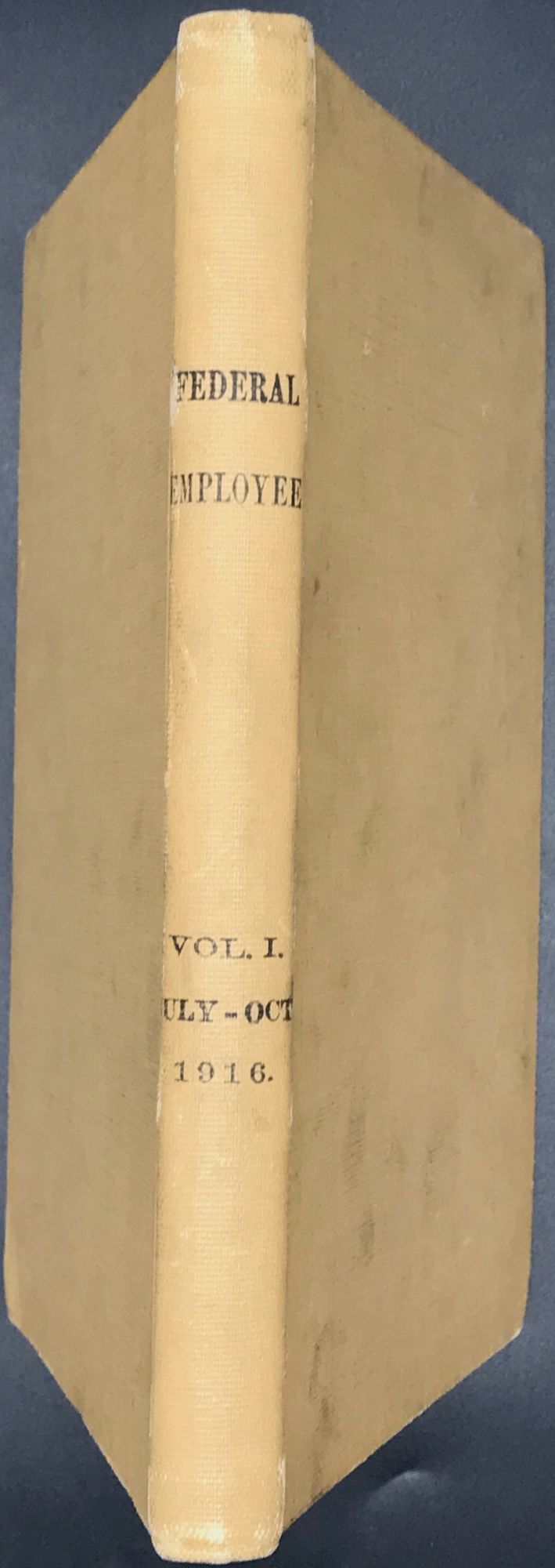 Washington, DC: published monthly by the Federal Employees Union No, 14632, 1916. 8vo.; 232pp. Bound in tan buckram, original paperwrappers bound in at front and rear. Each issue with a separate table of contents. Illustrated with photos, ads and political cartoons. Buckram moderately soiled; dates stamped on spine indicate only issues from July-Oct. 1916, but Nov. and Dec. are also present. A very good copy. First issue of this publication devoted to the interests of the employees and of the Civil Service of the United States.
