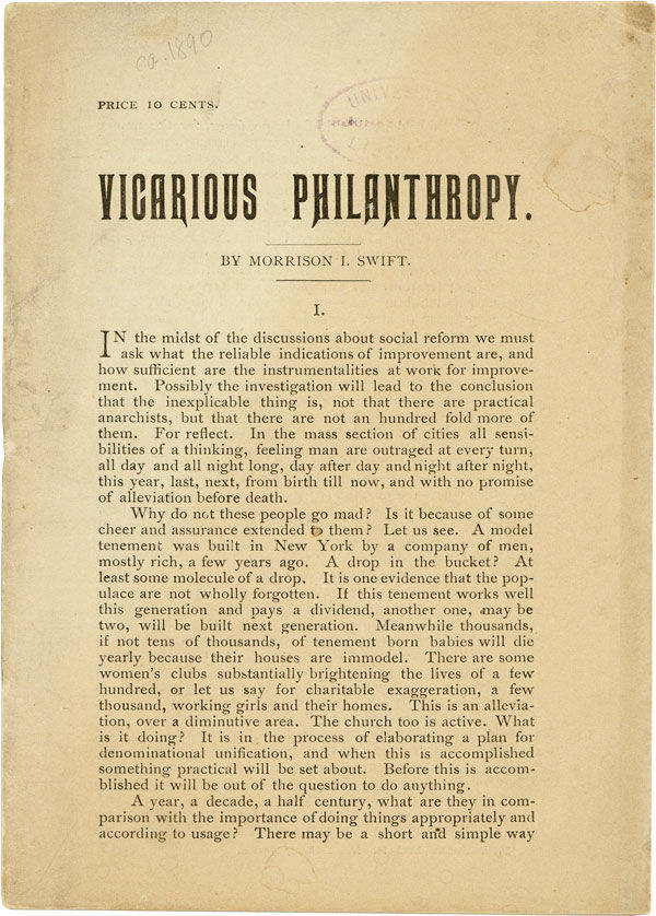 N.p., N.d., but ca. 1890. Small octavo (19.5cm.); sewn pamphlet; printed self-wraps; 24pp. Front cover soiled, with faint institutional hand-stamp; text clean and unmarked. An early work by the prominent Anarchist, utopian novelist, and eugenicist; a criticism of top-down social reform measures, encouraging would-be philanthropists to "repent of their crimes against the toilers...withdraw from corrupting alliances with caste and cultivation, and .. become Socialists, Anarchists, revolutionists." No date, but mentions the University Settlement of New York (founded in 1886) as "embryonic.