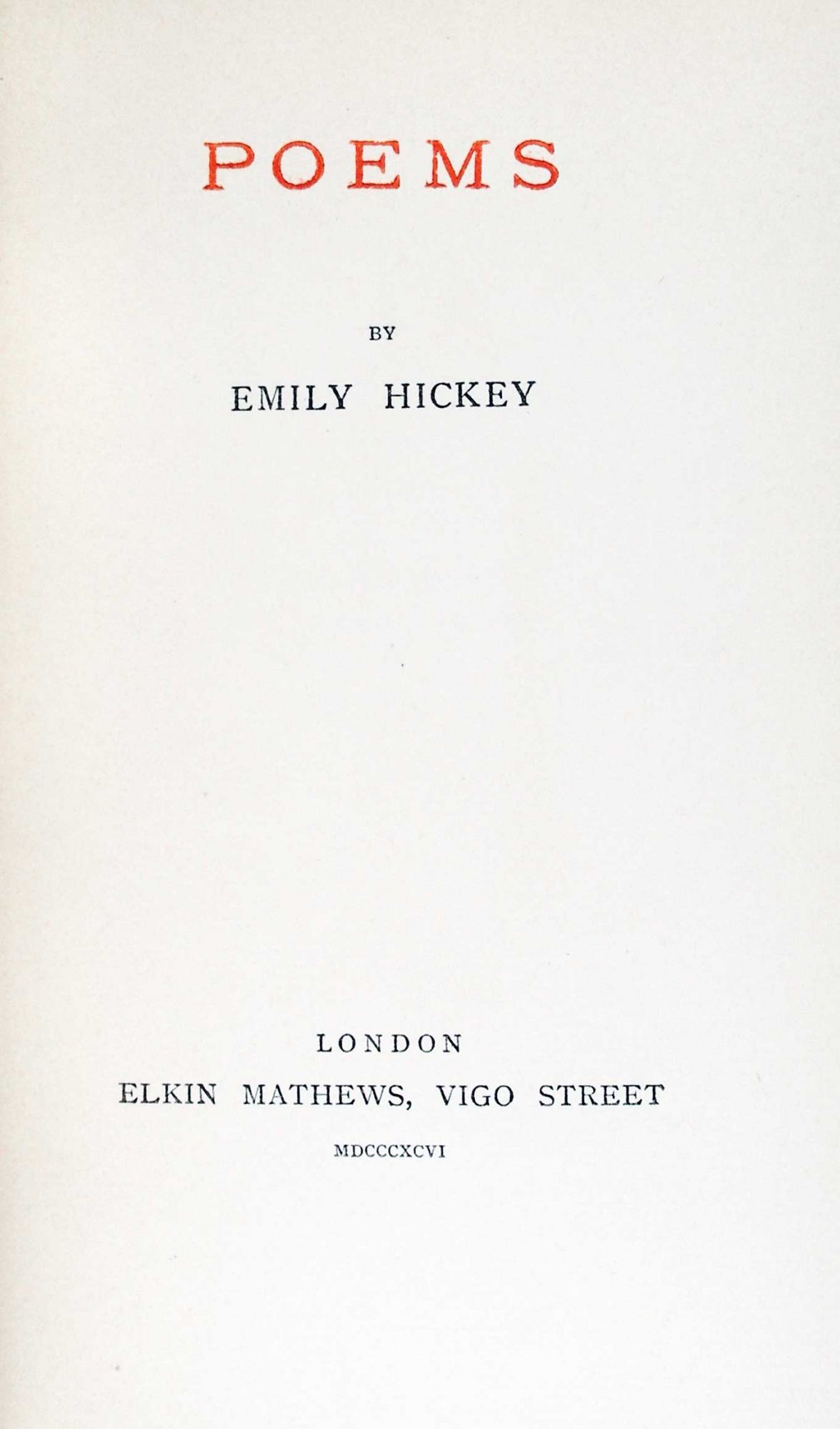 London: Elkin Mathews, 1896. Hardcover. Very Good. Hardcover. Scarce First Edition. Emily Henrietta Hickey (1845-1923) was a successful Irish author and poet. At the beginning of her career she contributed to many magazines, including Cornhill Magazine, Longman's Magazine, and the Irish Monthly. With Frederick Furnivall she founded the Browning Society in 1881.